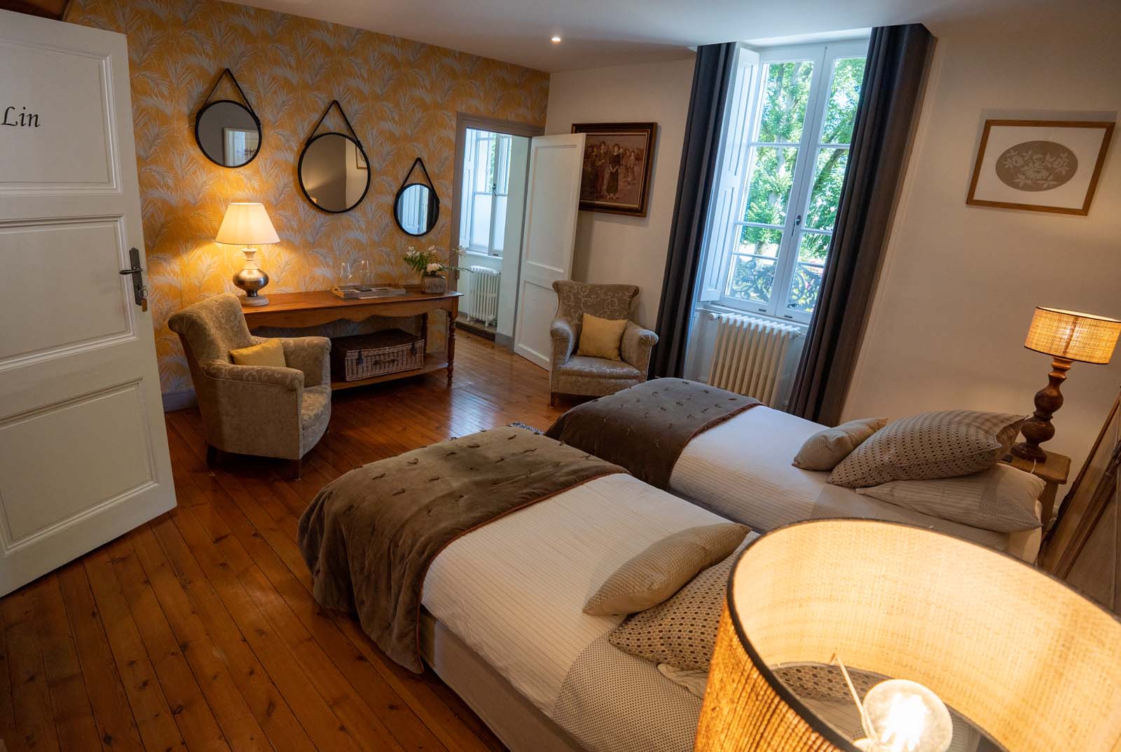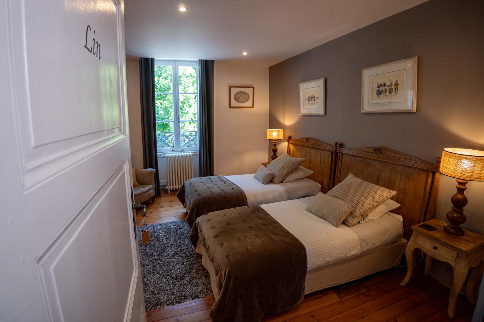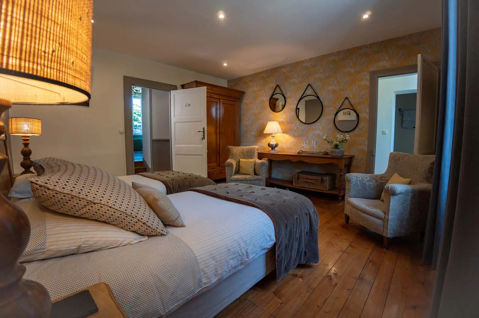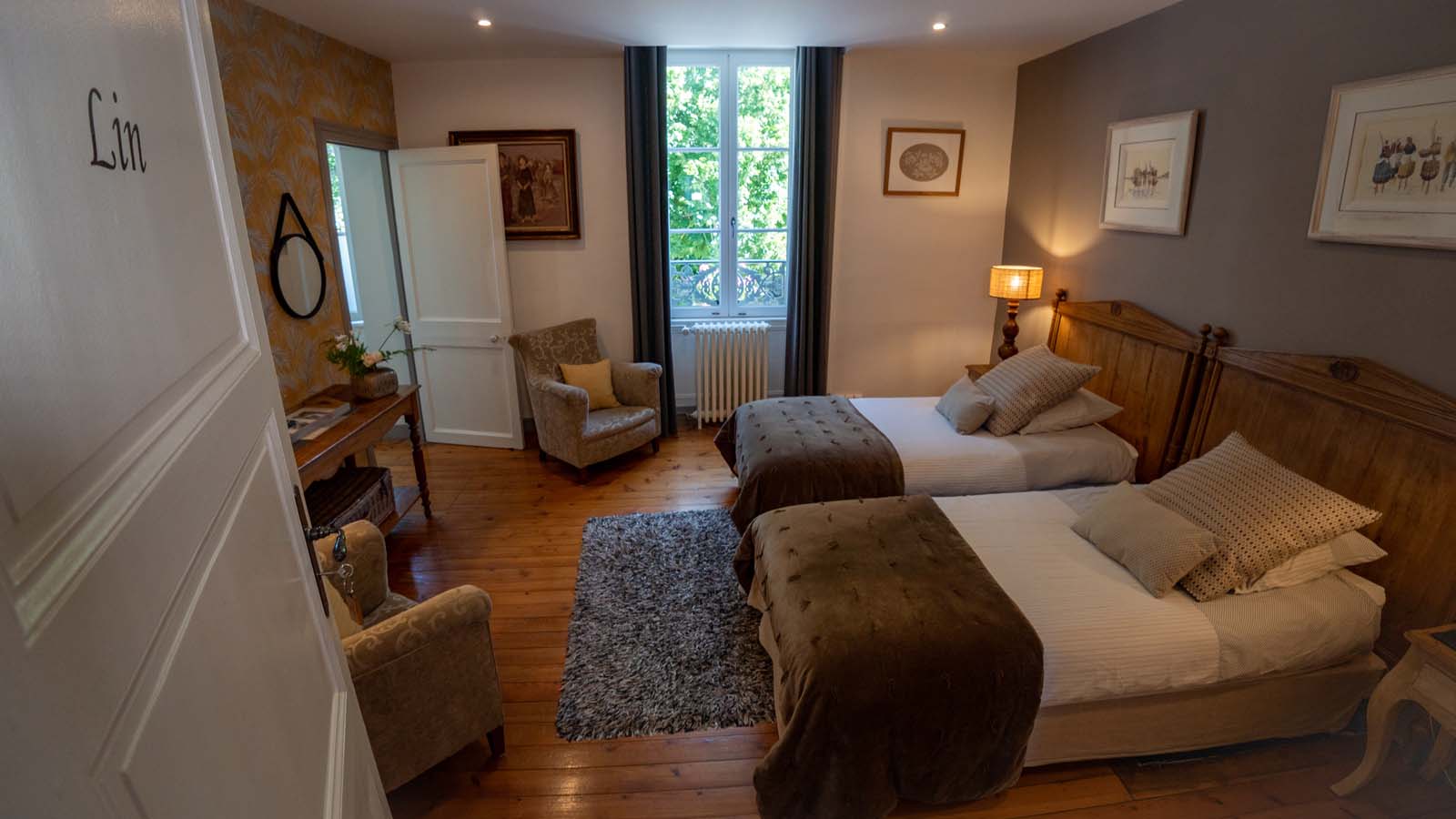 Dans une ambiance authentique et naturelle, la chambre d’hôtes Lin offre une vue sur la place Charles de Gaulle et propose soit deux couchages une personne de 90 cm chacun ou alors un couchage double de 180 cm, les lits ainsi que le linge de lit sont adaptables. Un espace salon est également présent avec deux fauteuils et une table. Une grande armoire vous permettra de ranger vos affaires personnelles. La salle d’eau privative est équipée de deux vasques, d’un WC ainsi que d’une grande douche à l’italienne. La chambre se situe au 1er étage.