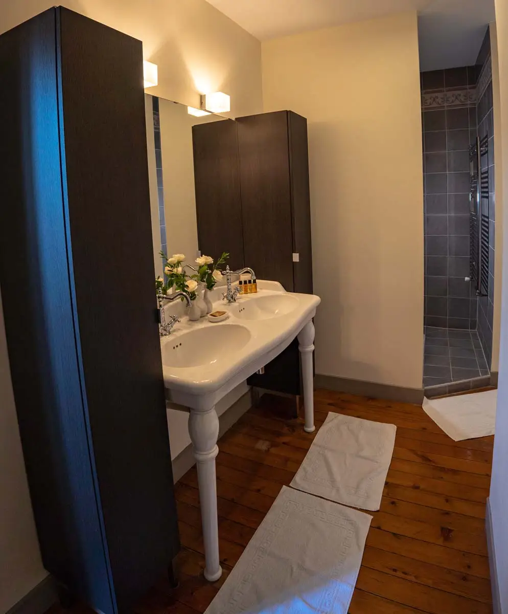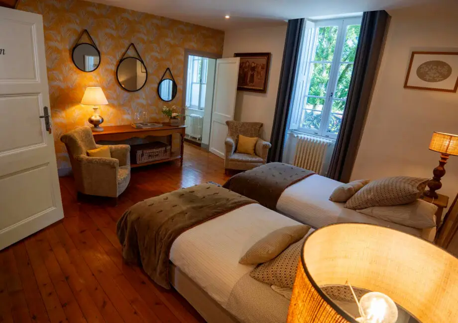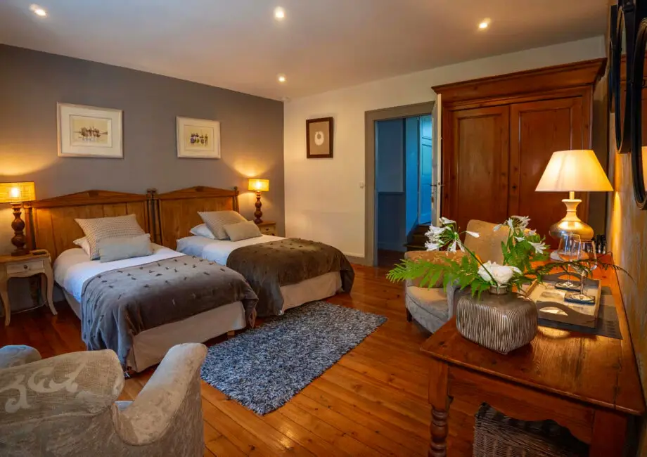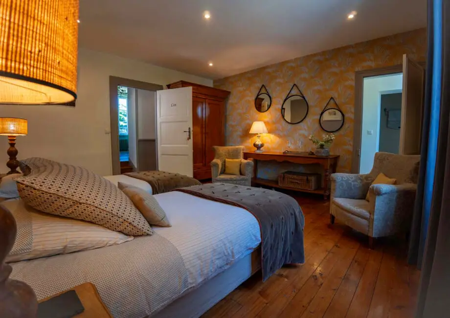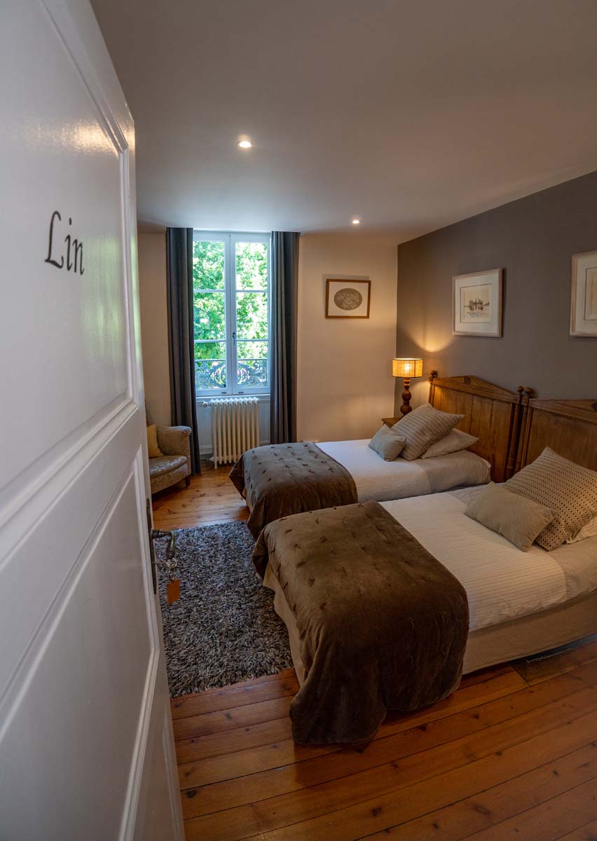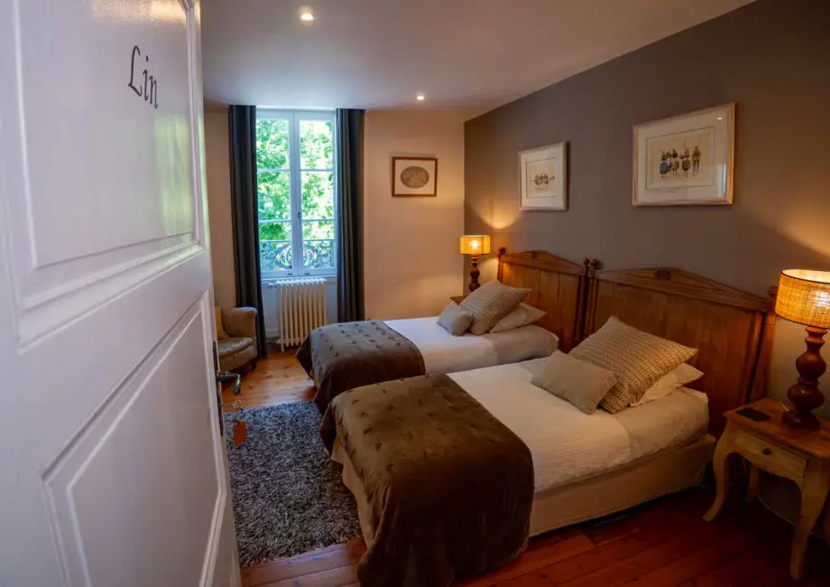 Dans une ambiance authentique et naturelle, la chambre d’hôtes Lin offre une vue sur la place Charles de Gaulle et propose soit deux couchages une personne de 90 cm chacun ou alors un couchage double de 180 cm, les lits ainsi que le linge de lit sont adaptables. Un espace salon est également présent avec deux fauteuils et une table. Une grande armoire vous permettra de ranger vos affaires personnelles. La salle d’eau privative est équipée de deux vasques, d’un WC ainsi que d’une grande douche à l’italienne. La chambre se situe au 1er étage.