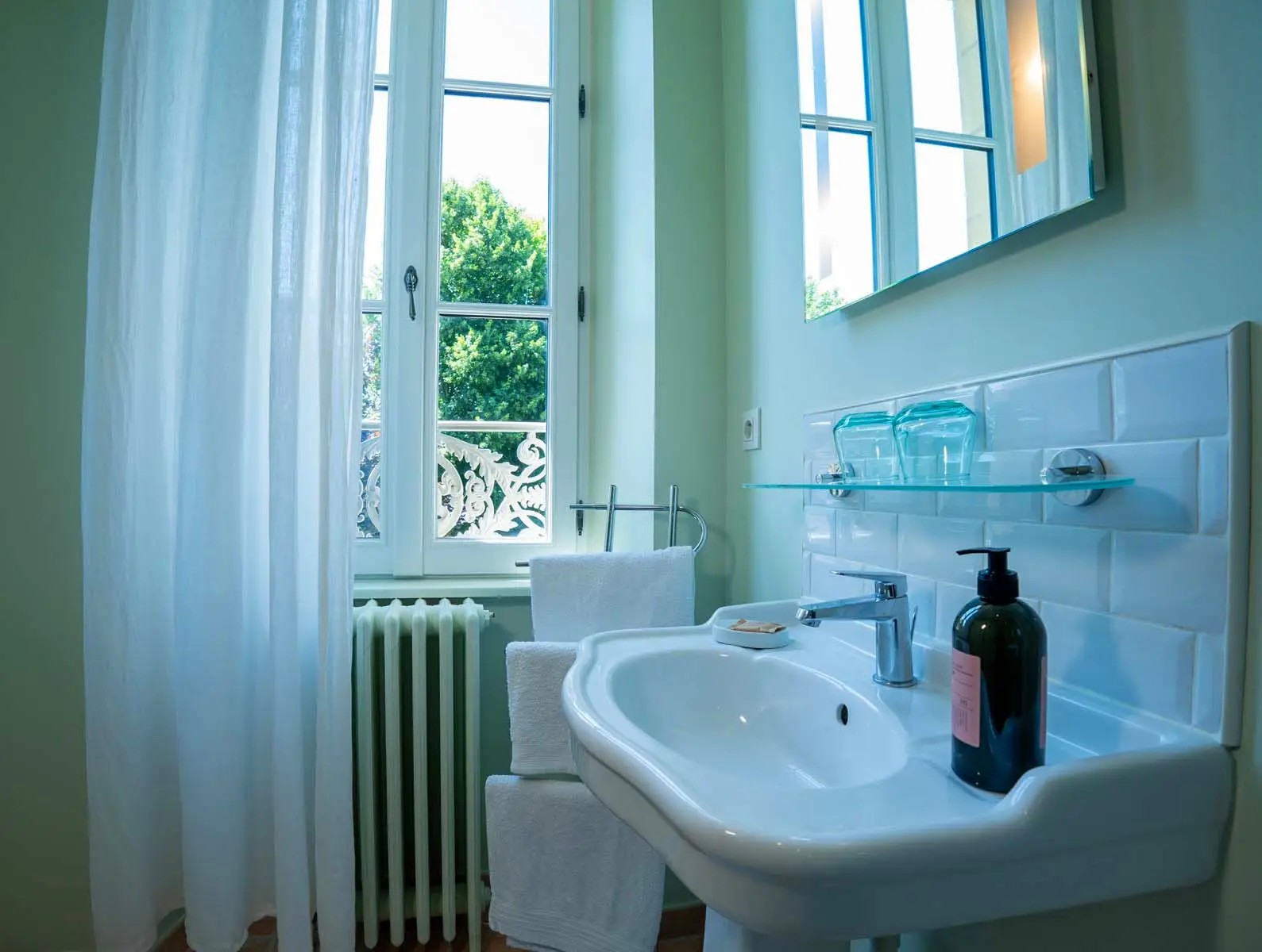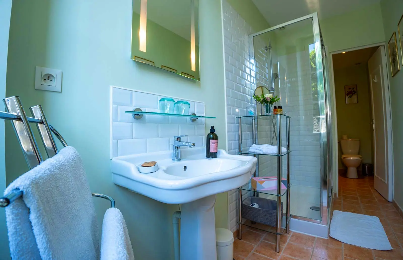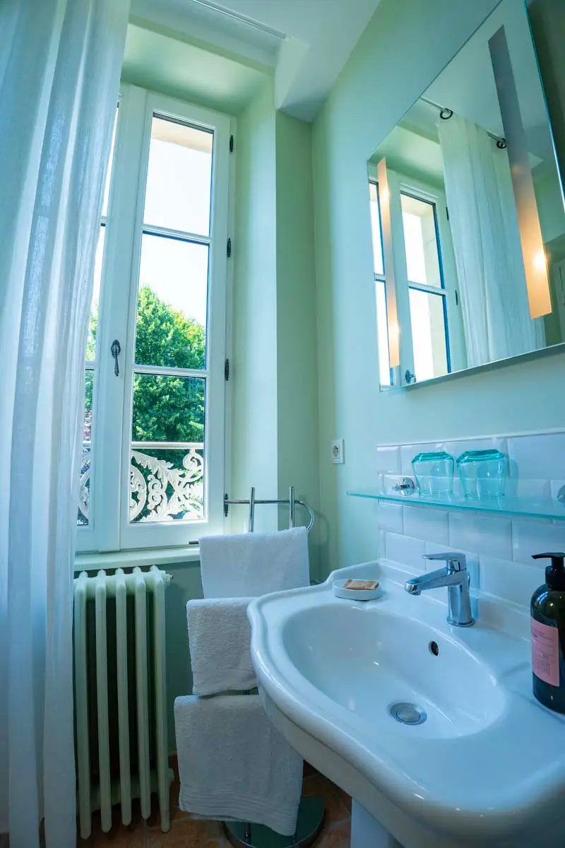 Located on the first floor of our house, it is served by a magnificent staircase, this room of all shades of pink and the most spacious of our guest house, very high ceilings, oak parquet, style fireplace decorated with a Venetian mirror, it offers a beautiful view of the garden.