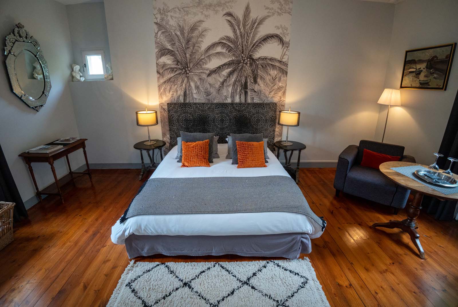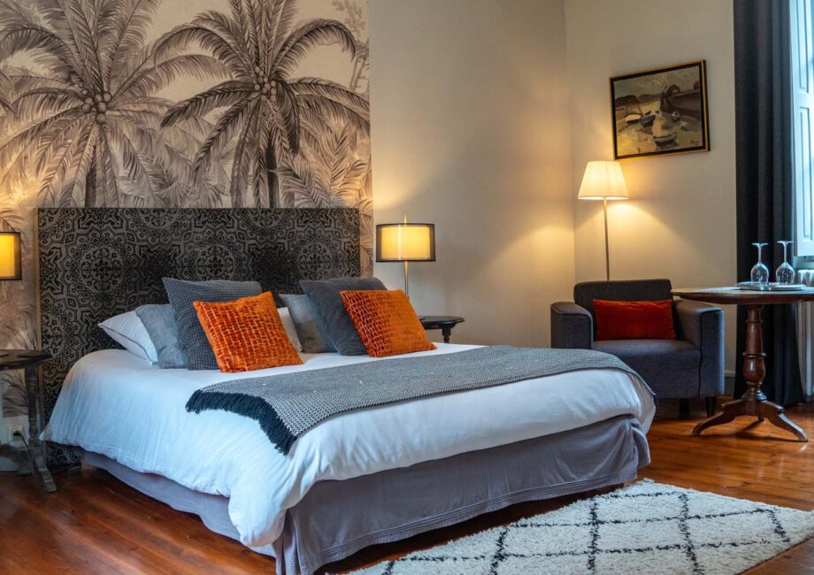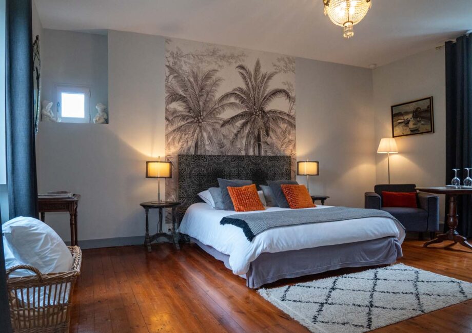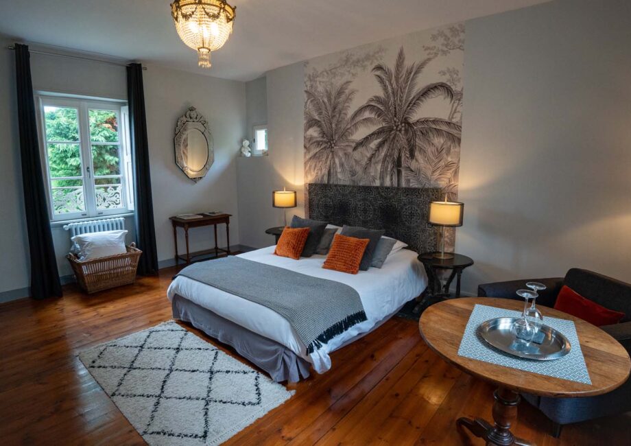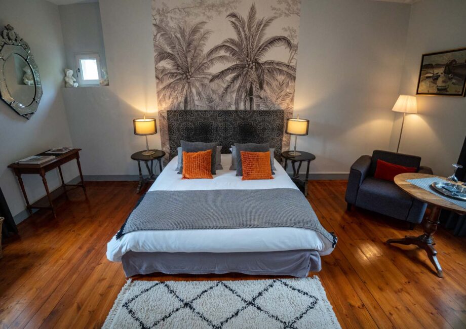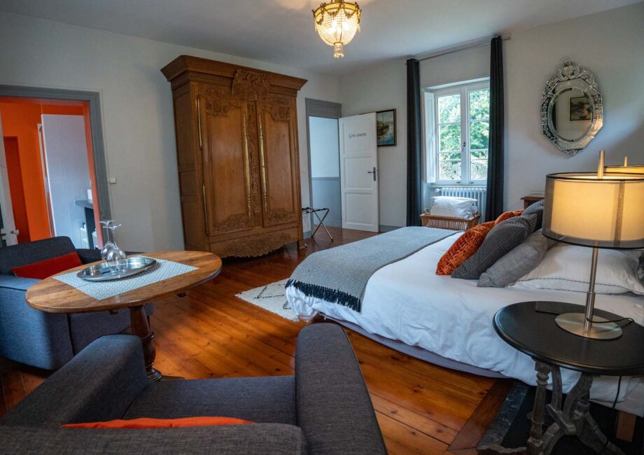 All dressed in gray, in a style combining the contemporary with the old, the Gris Souris guest room offers a view across the garden as well as on Place Charles de Gaulle. It has a 160 cm double bed and a lounge area with two armchairs and a table. You can store your belongings in a wardrobe always in line with the decoration.