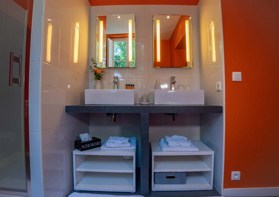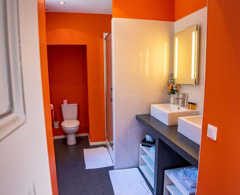 A private bathroom offers comfortable amenities: a toilet, a large 90×90 cm shower and two basins. All in a sober and warm atmosphere at the same time. The bedroom is on the 1st floor.